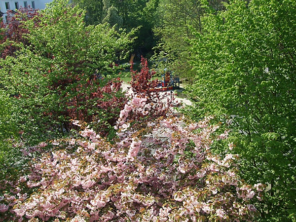 Und diesen Ausblick (zwischen den Bäumen sieht man den Kindergartenspielplatz)