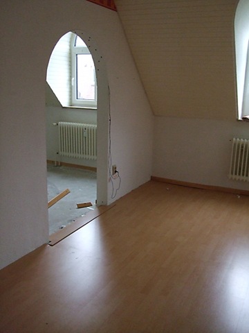 Schlafzimmer mit Durchbruch zu Janas Zimmer, bevor es losging. Auch hier: schief, schiefer, am schiefsten.